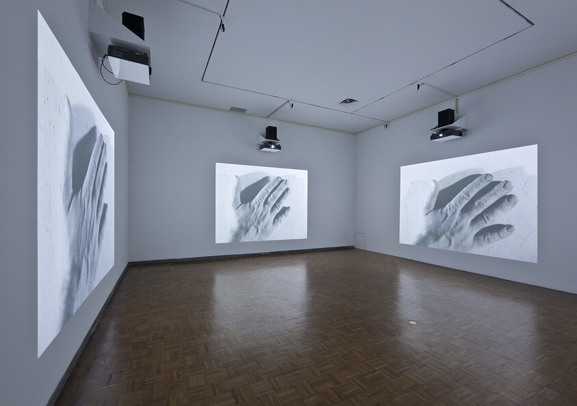 Echo comprises four black-and-white film loops that are projected simultaneously onto the four walls of an exhibition space. In each loop, Dennis Oppenheim uses his body as both a material and a tool, slapping the gallery walls with his hand in a paring down of the language of mark-making to its most simple form: the surface of the artist’s body meeting the surface of the artwork’s support. Like many artists of the late 1960s and early 1970s, Oppenheim created works that sought to transcend the gallery walls, which seemed to symbolize physical and psychological restriction. In Echo, he used the body’s most elemental force—its energy—to call attention to the boundaries of the gallery space. These boundaries are further emphasized by the soundtrack of four loud echoes ricocheting around the room. The reverberations form a trace of Oppenheim's slapping movements, articulating the shape of the gallery in aural terms and asserting a desire to burst through its physical limits—a goal that was central to many of the artist’s early projects in Body art, Earth art, performance, and film.
