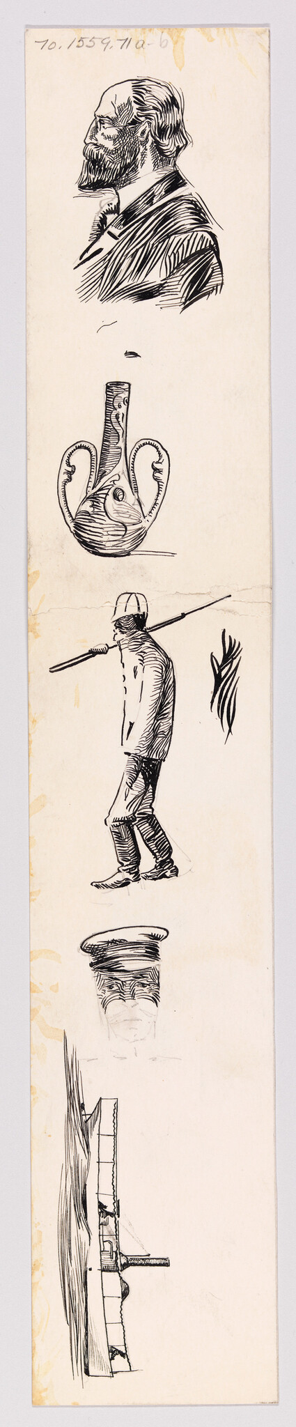 Verso: (Sketches of Man with Beard and Glasses, Vase, Fisherman, Man in Hat, and Ship)