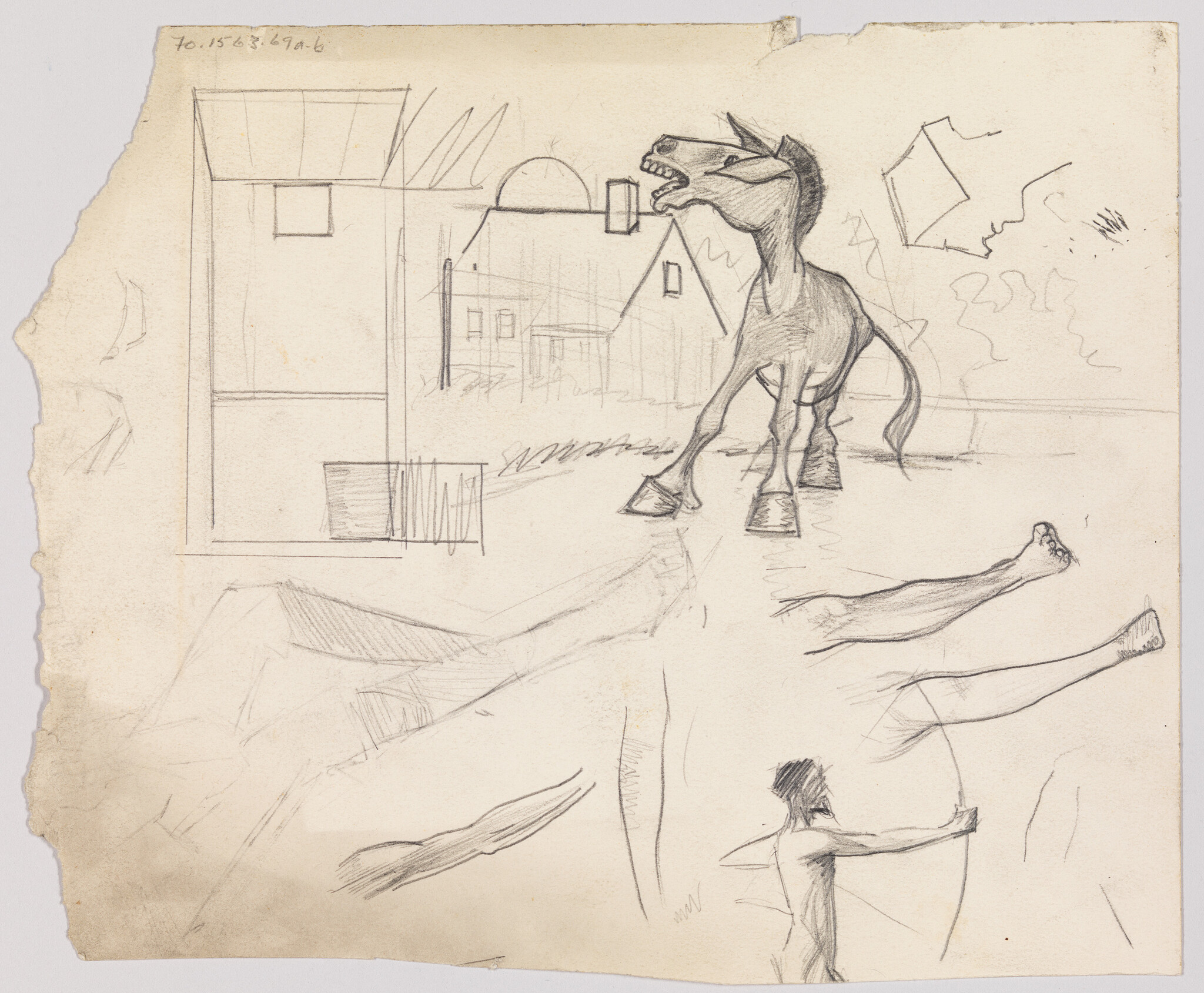 Verso: (Sketches of Houses, Horse, Male Figure, Arms, and Legs)