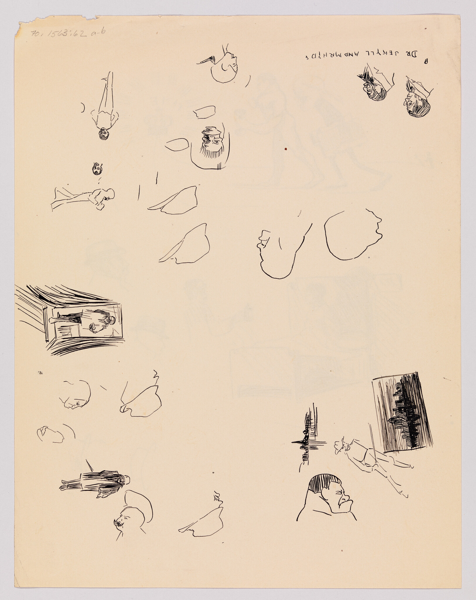 Verso: (Sketches of Dr. Jekyll and Mr. Hyde, Man in Doorway, Figures, Heads, and City Skyline)