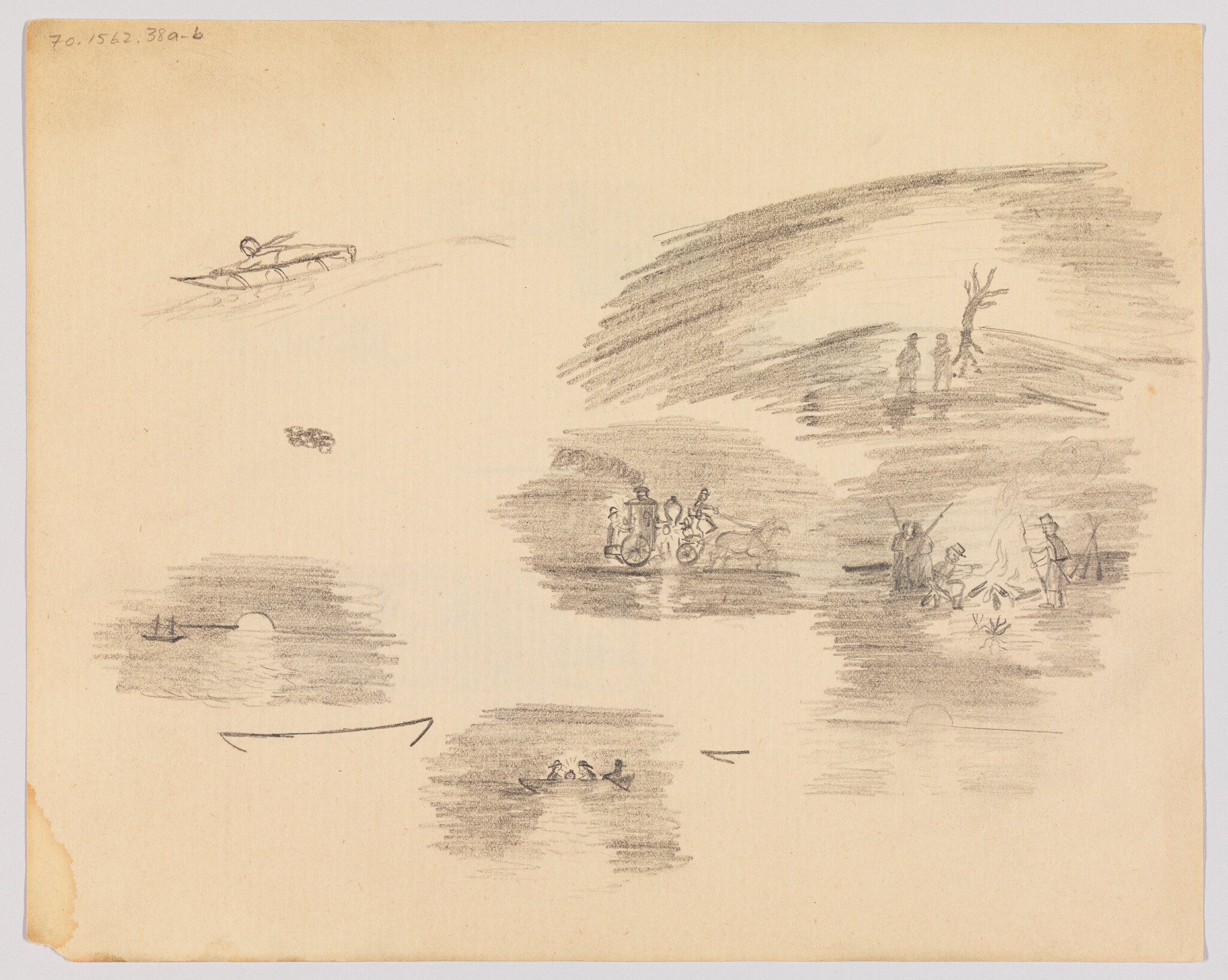 Verso: (Sketches of Horse-Drawn Carriage, Soldiers at Camp Fire, and Maritime Scenes)