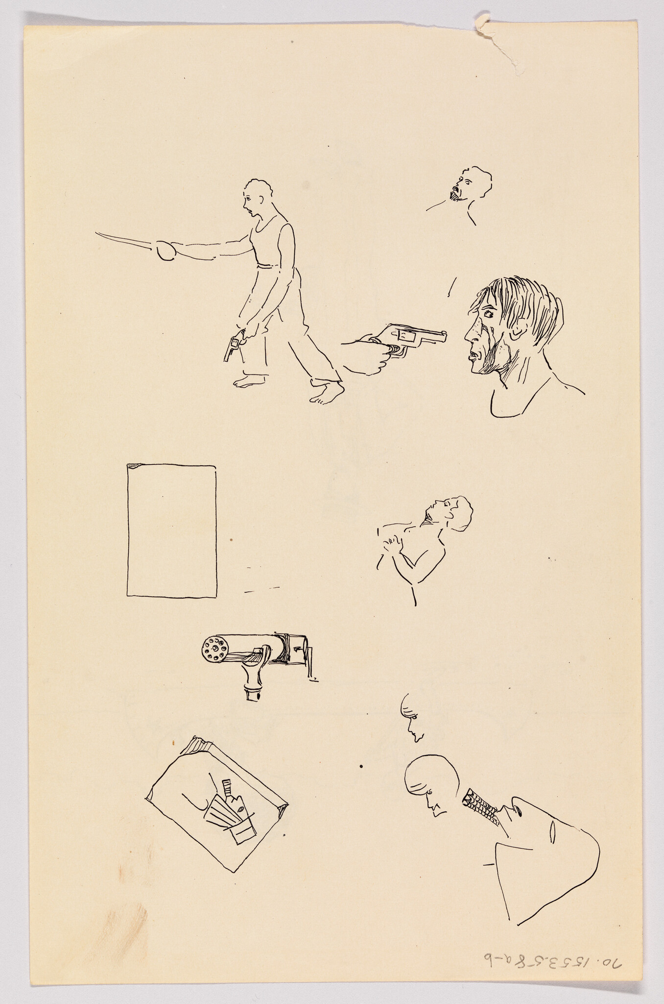 Verso: (Sketches of Man with Sword, Heads, and Guns)