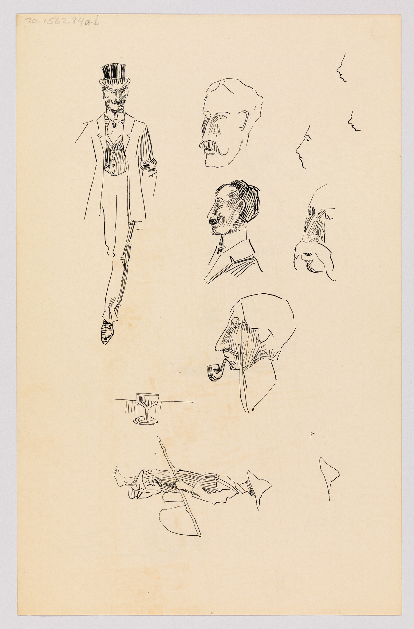 Verso: (Sketches of Man with Fishing Net, Man with Pipe, Male Heads and Wine Glass)