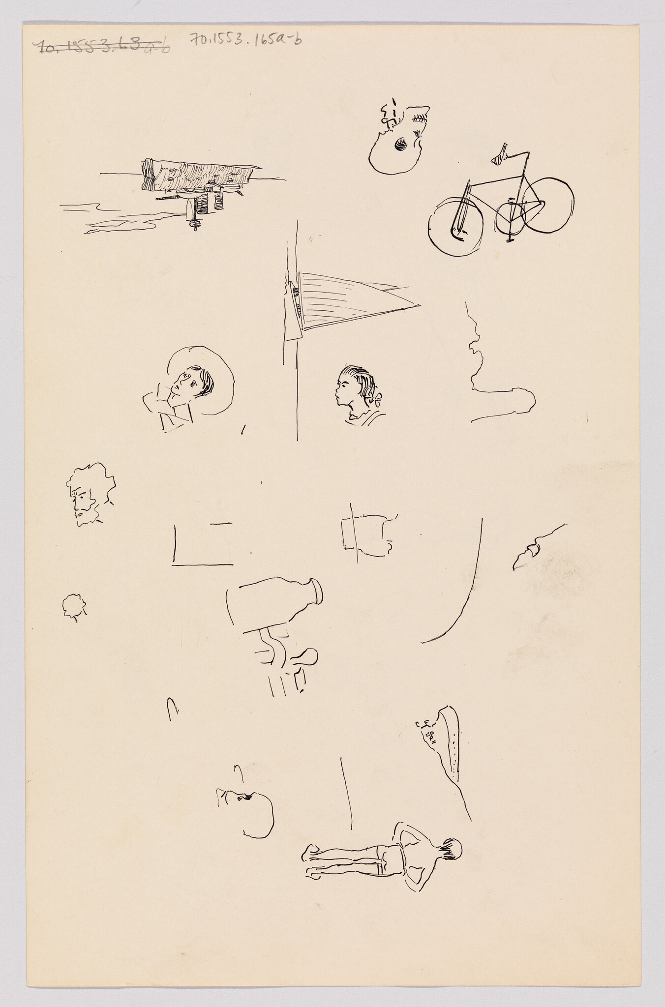Verso: (Sketches of Boats, Skull, Bicycle, Skyline, and Heads)