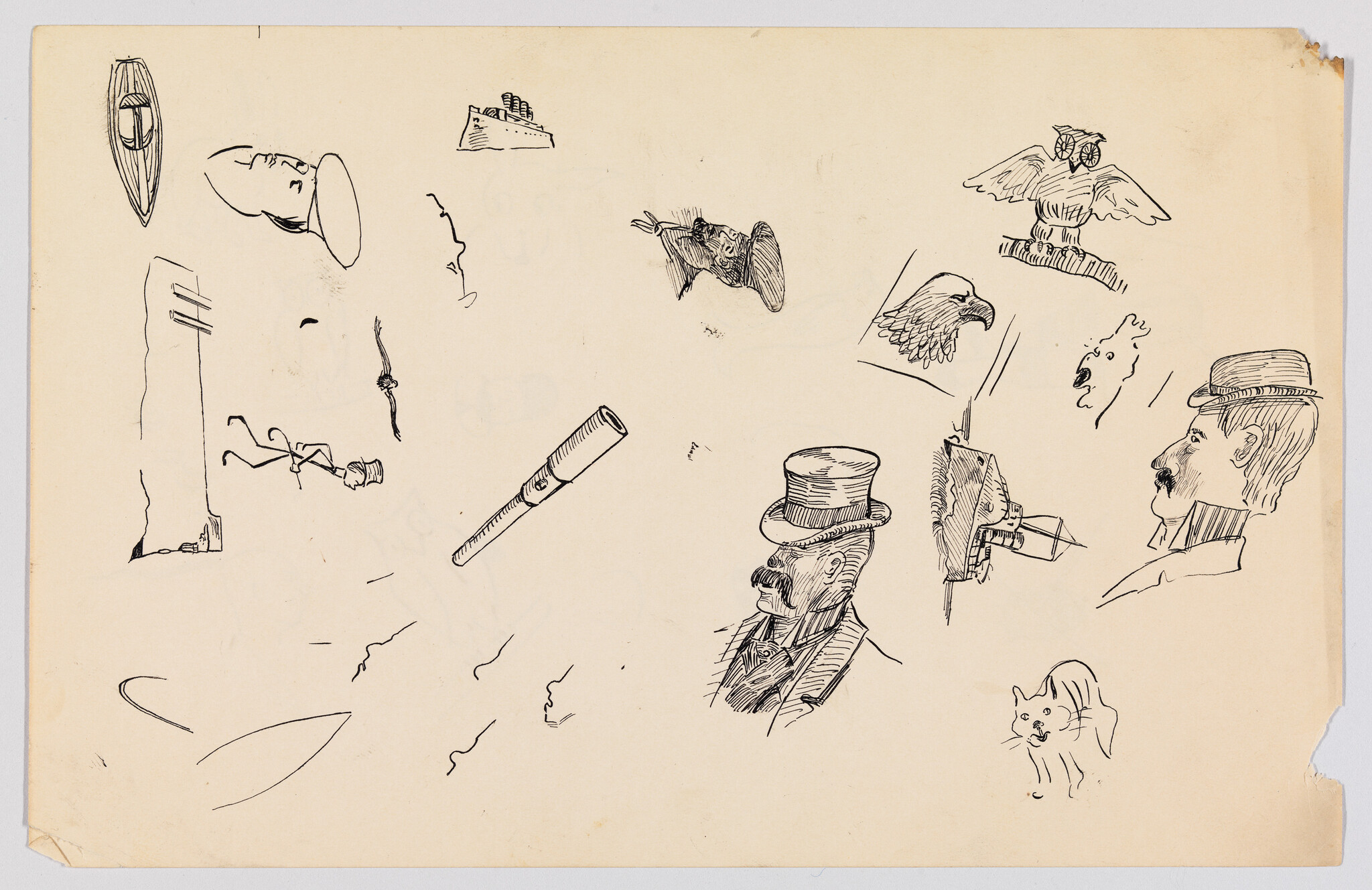Verso: (Sketches of Men in Hats, Birds, Telescope, and Ship)