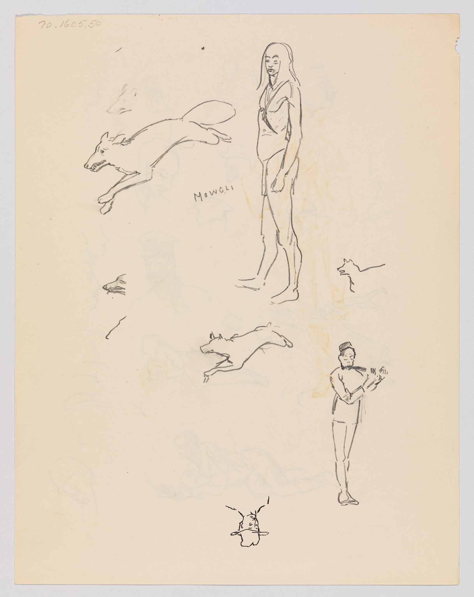 Verso: (Sketches of Mowgli, Dogs, Man Playing Flute, and Man in Hat)