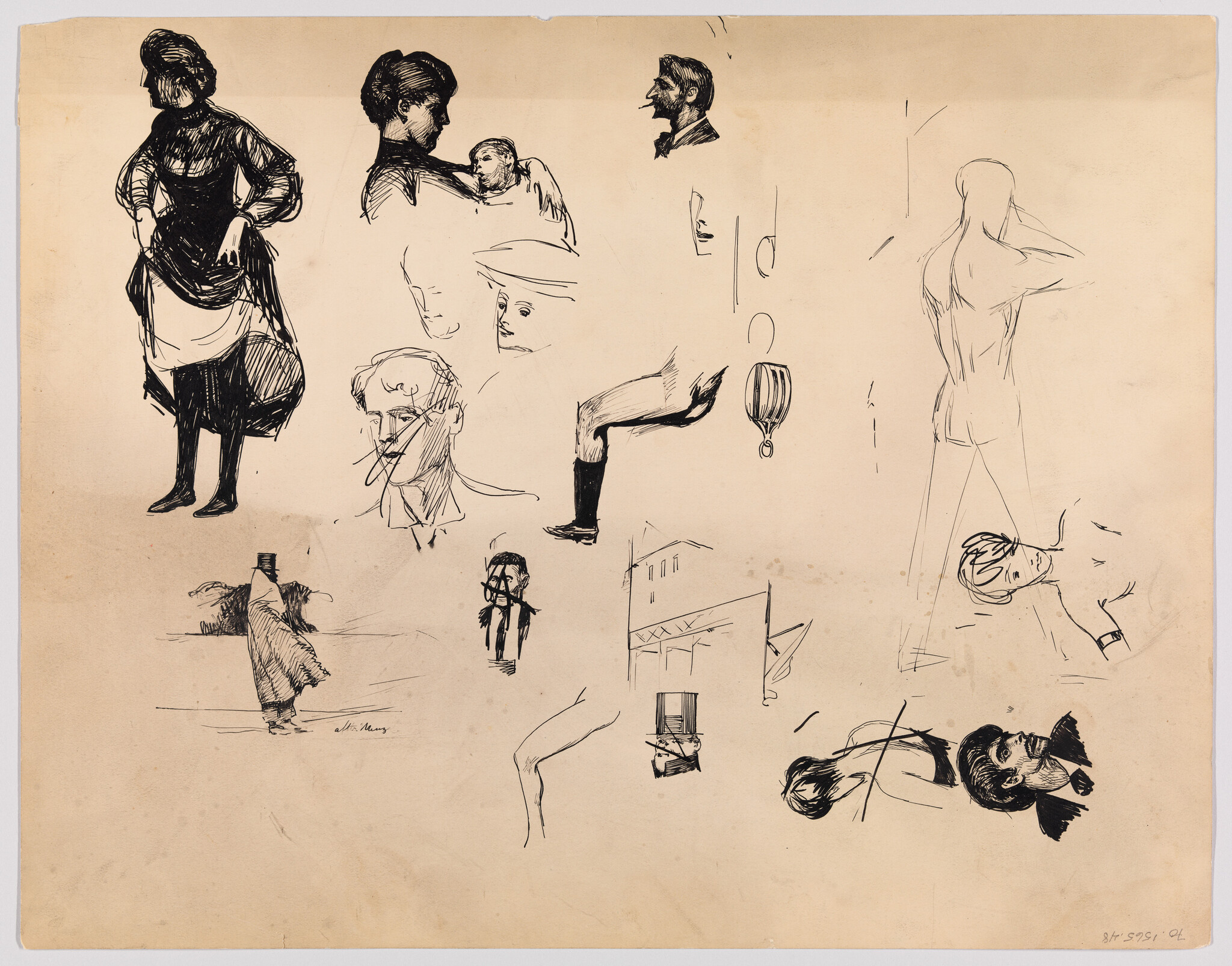 Verso: (Sketches of Woman Lifting Dress, Woman with Baby, Building, Heads and Figures)