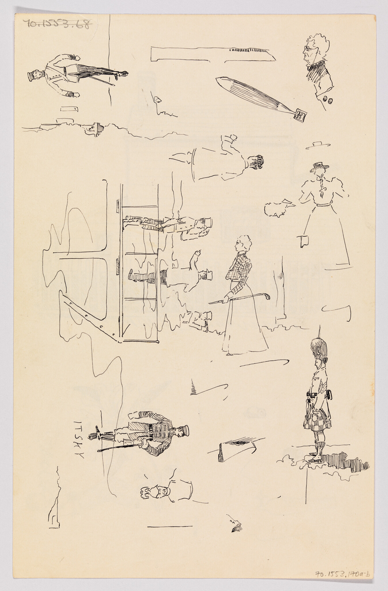 Verso: (Sketches of Sailors on Deck, Soldiers, Blimp, Golfer, and Figures)