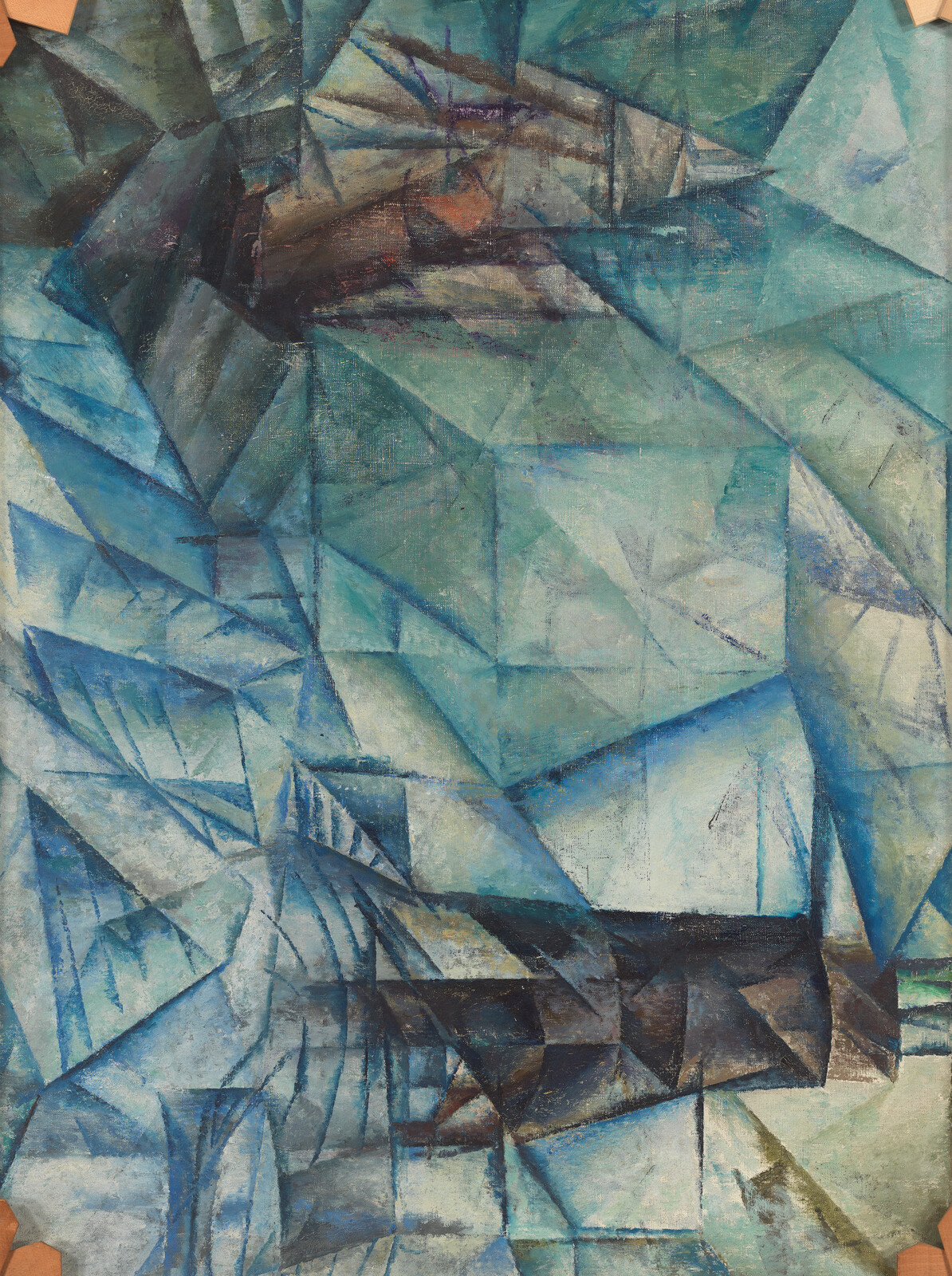 Gelmeroda is a small village on the outskirts of Weimar that Lyonel Feininger first visited in the summer of 1906. Soon thereafter, the town and its Gothic church began to appear as a backdrop in his figurative oils and drawings. In 1913, he painted the first of what would be a series of thirteen monumental oils focusing exclusively on the church and its spire. Executed over the course of more than two decades, the Gelmeroda series charts Feininger's changing treatment of light and form. Gelmeroda, VIII, painted during Feininger’s tenure as a professor at the Bauhaus in Weimar, demonstrates the artist’s engagement with a vocabulary of layered, prismatic forms during this period. Set into the surrounding sky like a faceted jewel, the church seems to embody Feininger’s assertion that he was interested in painting the space around objects, not objects themselves. The solemn churchgoers at the lower edge—figures who establish the monumental scale of the architecture—seem similarly incorporeal, reduced to a group of translucent, earthbound triangles. The effect, however, is not one of traditional hierarchy, but of unity: in Feininger’s painting, heaven and earth are facets of a single, ethereal reality.