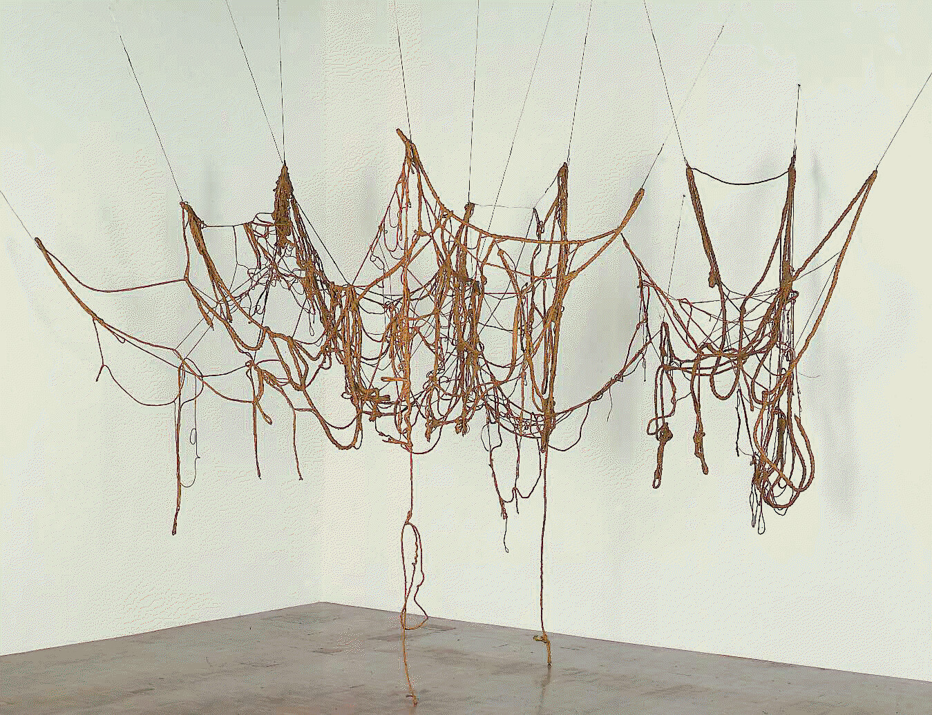 Like much of Eva Hesse’s work, No Title substitutes fragile substances and irregular, organic forms for the rigid geometries and industrial materials of Minimalism, one of the dominant modes of art-making in the mid-1960s. The sculpture is one of Hesse’s last works before her untimely death at the age of thirty-four. To create it, Hesse dipped two separate pieces of knotted rope into liquid latex. The rope then hardened, providing an underlying weblike structure for the sculpture’s gracefully arching loops and dense, twisted segments. It attaches to the ceiling and walls in thirteen points, but these placements are flexible to allow for variable installations. This mutability was in keeping with Hesse’s intention for the work. A drawing she made while conceptualizing the piece was accompanied by a note which read, "hung irregularly tying knots as connections really letting it go as it will. Allowing it to determine more of the way it completes its self."