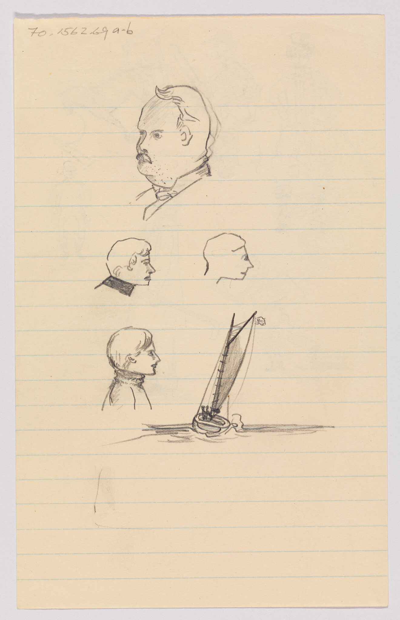 Verso: (Sketches of Sailboat and Men's Heads in Profile)