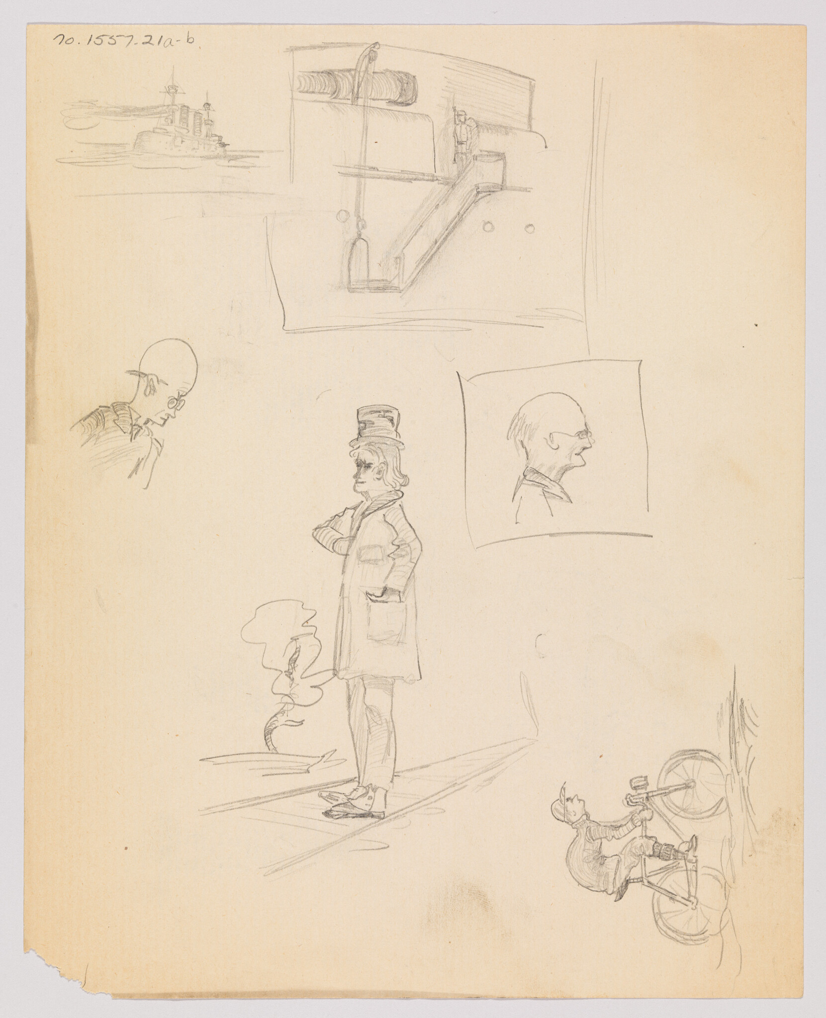 (Sketches of Ships, Man Riding Bicycle, Man with Top Hat Near Tree, and Figures)